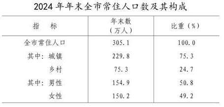 據(jù)2024年人口抽樣調(diào)查,年末全市常住人口為305.1萬人,比上年末減少2.8萬人。其中,城鎮(zhèn)常住人口229.8萬人,占常住人口比重為75.3%,比上年末提高0.9個百分點(diǎn)。全年全市出生人口1.9萬人,人口出生率為6.1‰;死亡人口2.5萬人,死亡率為8.3‰;自然增長率為-2.2‰。