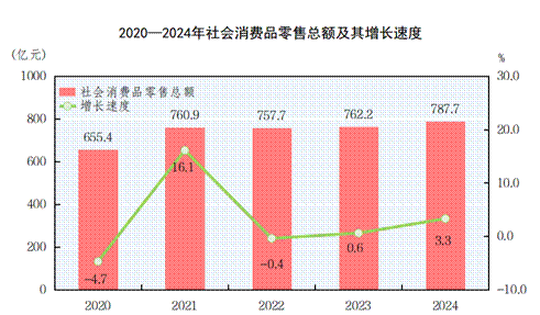全年全市社會消費(fèi)品零售總額787.7億元,比上年增長3.3%。按經(jīng)營地統(tǒng)計,城鎮(zhèn)消費(fèi)品零售額668.4億元,增長2.9%;鄉(xiāng)村消費(fèi)品零售額119.3億元,增長5.7%。按消費(fèi)類型統(tǒng)計,商品零售額717.8億元,增長3.2%;餐飲收入額69.9億元,增長5.1%。