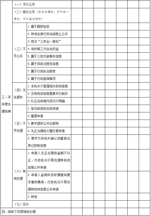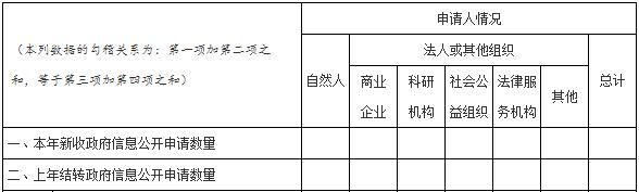 這一項主要報告兩方面情況:一是申請人的類別;二是政府信息公開申請的最終處理結(jié)果。此項內(nèi)容重在數(shù)據(jù)準(zhǔn)確、要素齊備,全面客觀反映政府信息公開申請接收和辦理情況,便于政府信息公開工作主管部門全面掌握工作動態(tài),使社會各界了解政府公開透明進(jìn)程。