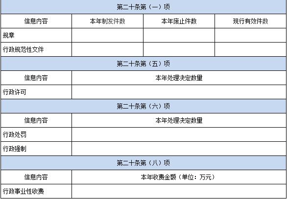 各行政機(jī)關(guān)年度報告格式模板附后。此前有關(guān)政府信息公開的各類報告和統(tǒng)計口徑,隨原政府信息公開條例的失效而失效。政府信息公開工作主管部門負(fù)責(zé)匯總的本級政府年度報告格式,參照這一格式模板辦理。黨的工作機(jī)關(guān)加掛行政機(jī)關(guān)牌子的單位,年度報告內(nèi)容依據(jù)全國政府信息公開工作主管部門發(fā)布的有關(guān)規(guī)定(國辦公開辦函〔2019〕51號)確定,并參照這一格式模板辦理。